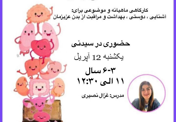 کارگاه تک جلسه ای - ماهی یکبارمی خواهیم بدنمان را بیشتر بشناسیم تا مراقبت، صلح و پذیرش آن را از کودکی تمرین کنیم یکشنه 12 آپریل ، ساعت ١١ الی ١٢:٣٠ برای کودکان ٣ تا ۶ سال به صورت حضوری در منطقه پیمبل سیدنی 2 Riddles Ln Pymble